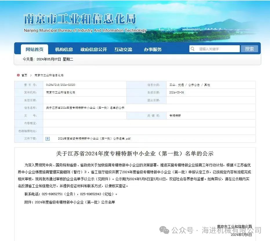 海进机械荣获“2024年度省级专精特新中小企业”认证